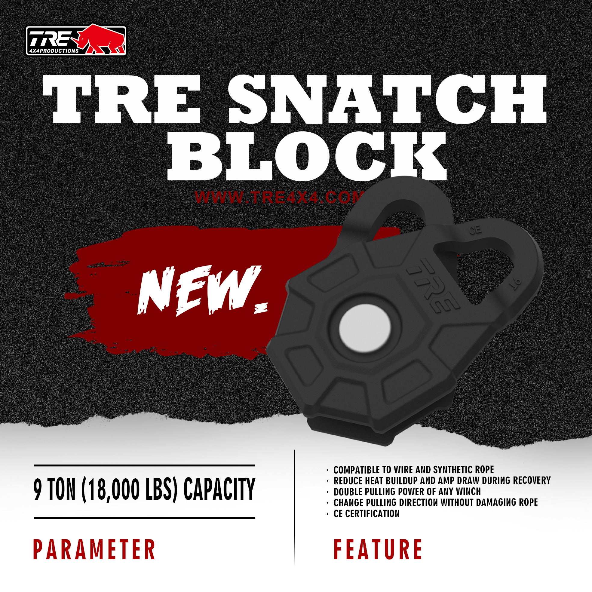Brand-new TRE Snatch Block is coming! See how it makes much difference! Under proper use, it could double the winch pulling power to easily drag your beloved vehicle out of mud or anywhere that needs recovery without damaging the rope. It also helps to reduce heat buildup and amp draw during recovery. Accepts both wire and synthetic winch rope. You can choose from units rated to handle up to 5, 12, or 18,000 pounds, suitable for most offroad recovery situations.